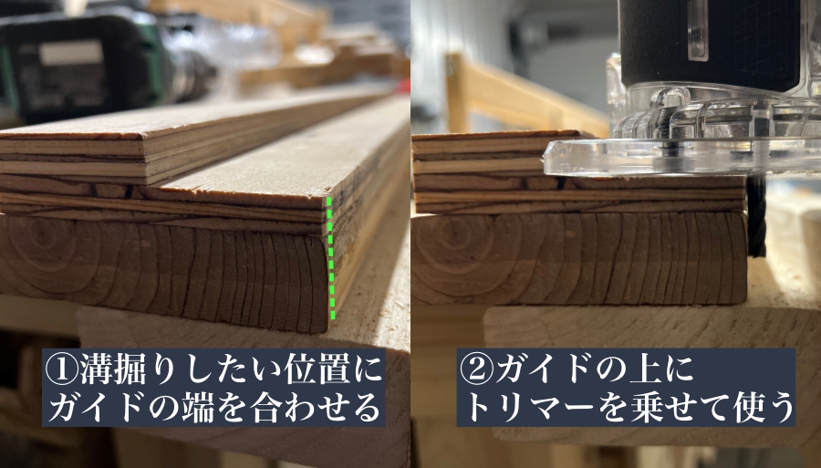 上記画像のような合板で作った自作ガイドは、ガイドと切削したい位置を合わせることで、他のガイドよりも簡単に設置できます。